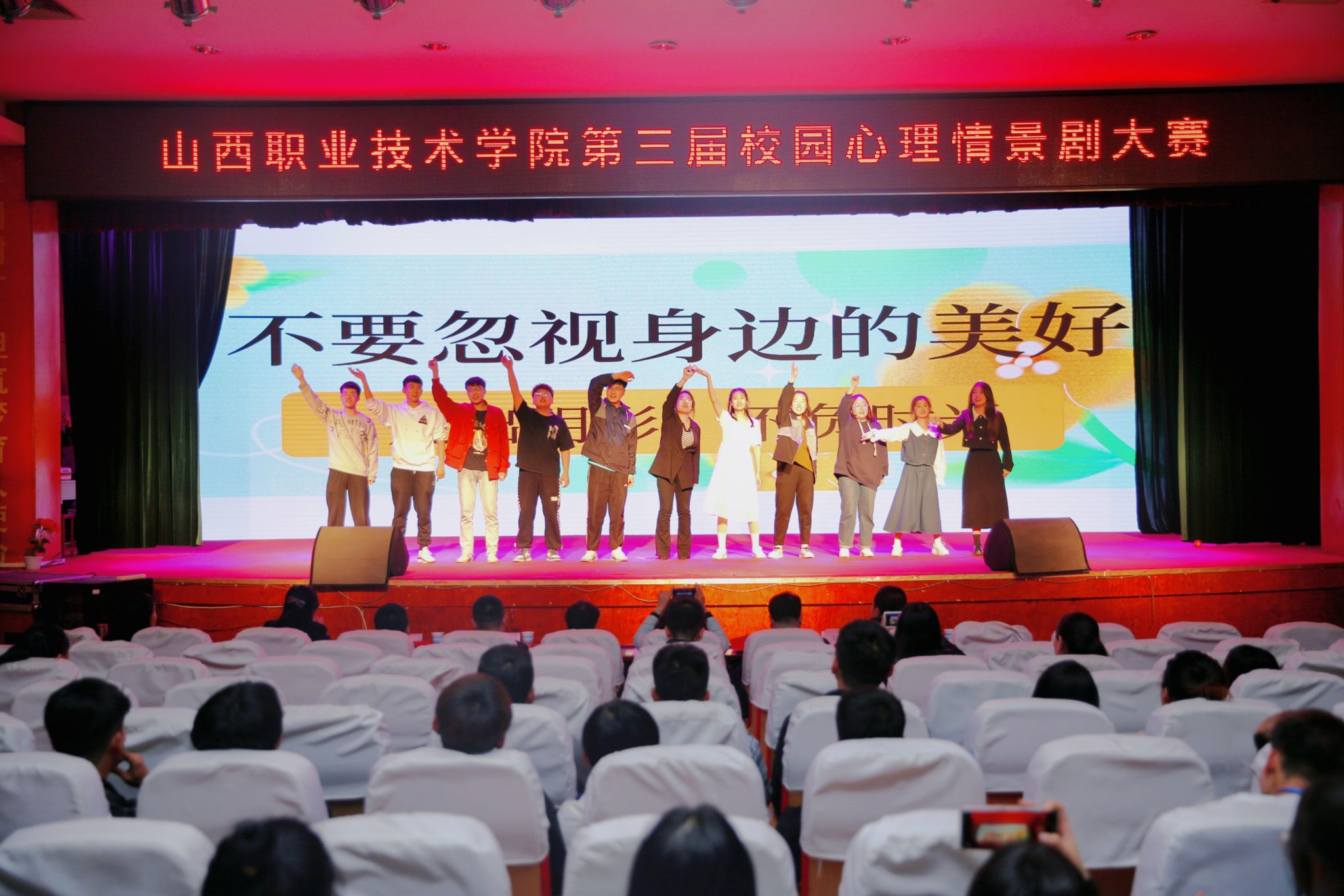 校园心理情景剧摆脱传统的组织形式,从“以教师为中心,教材为中心,教室为中心”的框架中解脱出来,真正确立“以学生为中心,以活动为中心,以学生的主动参与为中心”的教学理念。今后我们将不断丰富创新活动载体,为更多的学生搭建舞台,让更多的学生关注自身心理健康,愿每个学生都能以梦为马,不负韶华!