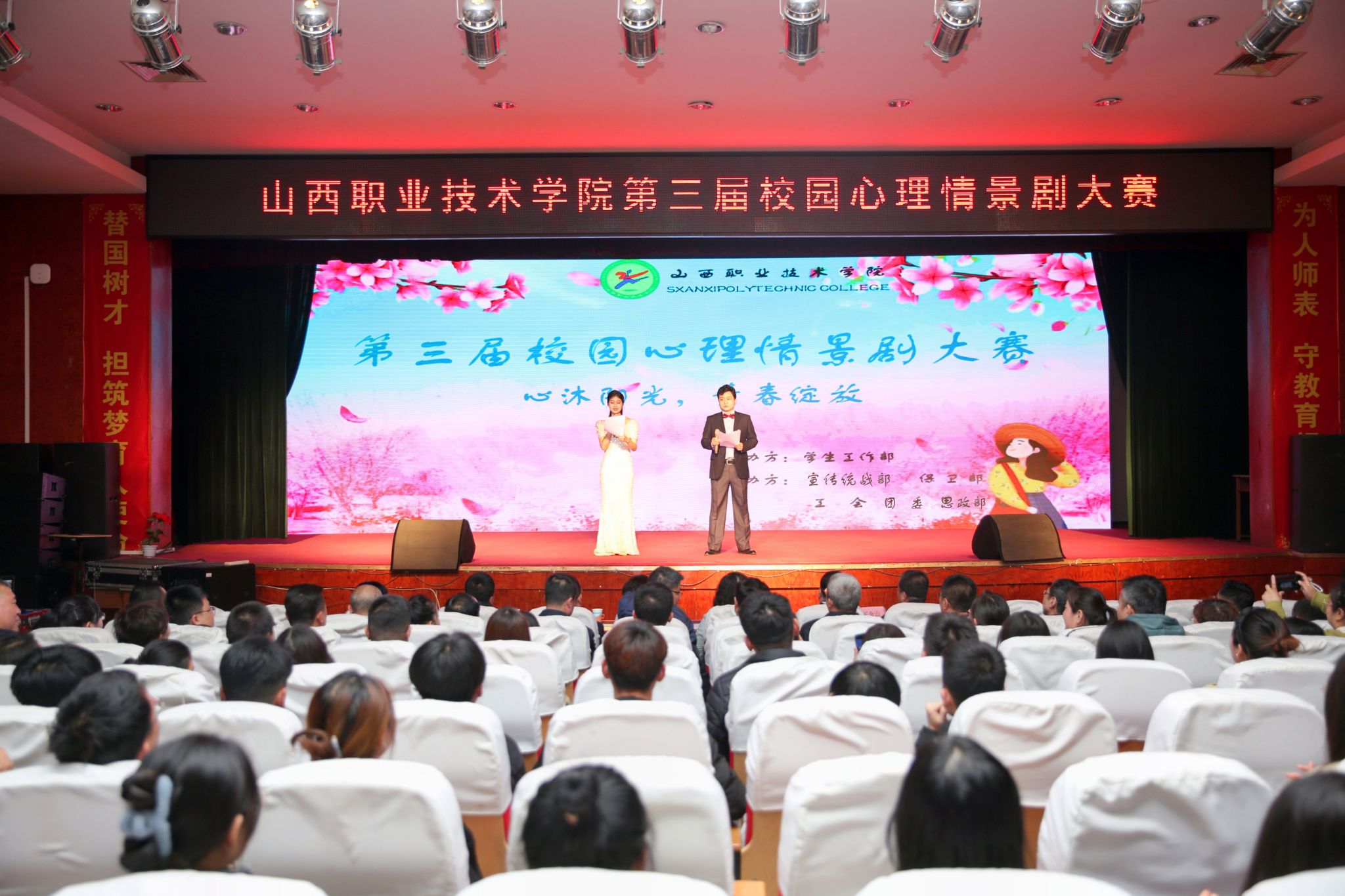 为深入学习贯彻党的二十大精神,普及心理健康知识,引导学生关注心灵成长,提高心理困惑应对能力,提升学生心理素质,推动学院心理健康和思想引领工作深入开展,营造和谐健康向上的校园文明氛围,积极推进校园文化建设,开云官网于4月25日开展了“心沐阳光,青春绽放”为主题的第三届校园心理情景剧大赛,最终在长风校区落下帷幕。本次大赛由学生工作部主办,宣传统战部、团委、保卫部、思政部等各部门协办。此次活动得到了学院领导的高度重视,党委书记雷承锋;党委副书记、院长何秋生;党委副书记尤陶江;党委委员、纪委书记牛惠斌;党委委员、副院长赤新生;党委委员、副院长李芳;党委委员、副院长蔚志坚;党委委员宋海宏;党委委员张武奎及各系、各部门负责人及各校区师生代表参加大赛。