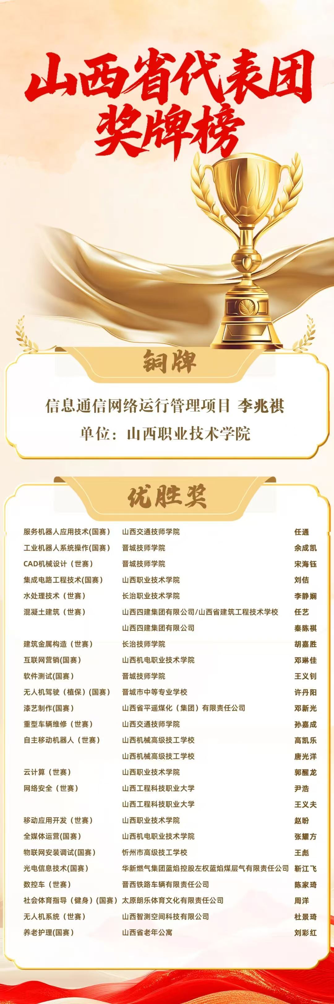 铜牌的成绩,既是对李兆祺个人专业素养与教学能力的高度认可,更是学院深化“岗课赛证”综合育人改革的标志性成果,生动诠释了学院服务山西数字经济战略、打造信息技术人才培养高地的责任担当。近年来,学院始终坚守“以赛促教、以赛促学、以赛促改”理念,将国家级技能大赛标准深度融入人才培养全流程,创新构建“产业需求—课程体系—技能竞赛—职业证书”四维联动育人新范式,累计为山西数字经济高质量发展输送大批高素质技术技能人才。