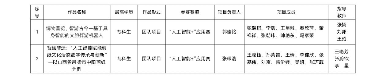 根据第十九届“挑战杯”全国大学生课外学术科技作品竞赛“人工智能+”专项赛参赛组织工作安排,拟推荐以下2件作品参加第十九届“挑战杯”全国大学生课外学术科技作品竞赛“人工智能+”专项赛。现予以公示,公示时间为2025年7月8日至7月11日。如有异议,请在公示期内实名向院团委反映。