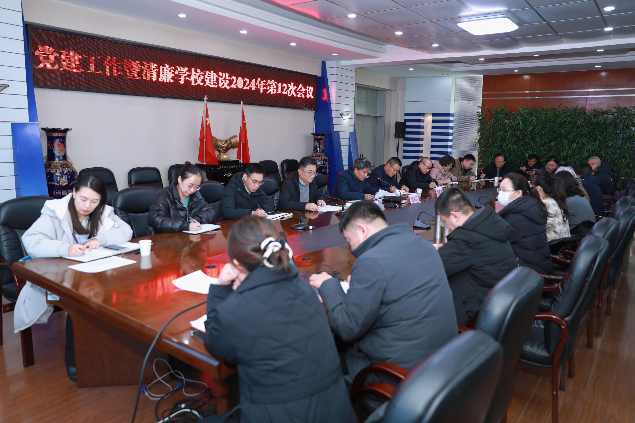 12月30日下午,学院2024年度第十二次党建工作暨清廉学校建设例会在坞城校区四层会议室召开。会议由学院党委副书记尤陶江主持,学院纪委书记牛惠斌出席会议。党政办公室、纪委办公室、组织人事部、宣传统战部等部门相关人员,各校区党工委、各党总支负责同志参加会议。
