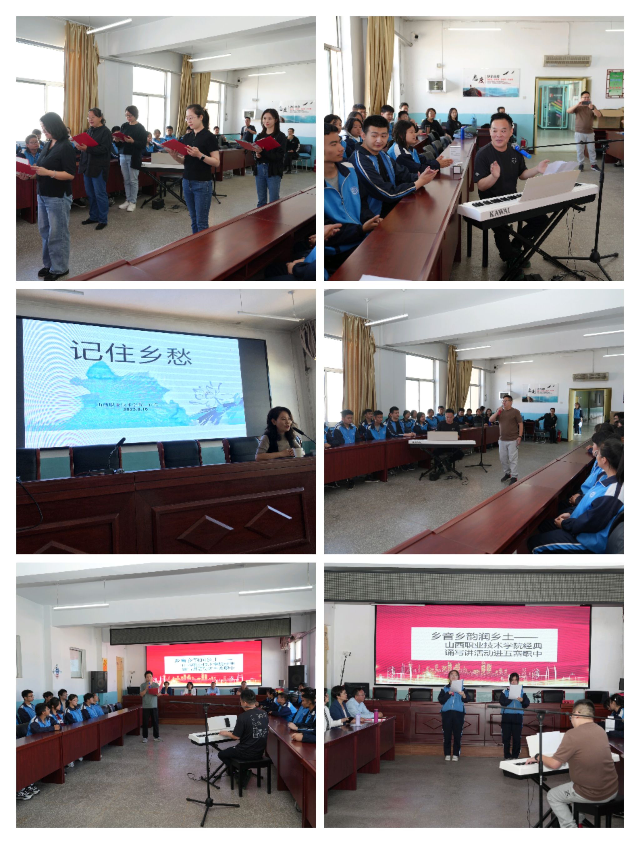 活动现场气氛热烈。武峰老师为大家献上李白《行路难(其一)》和苏轼《水调歌头》的朗诵,武老师浑厚饱满的嗓音、潇洒自适的表演,把这两首经典古诗词的魅力诠释地淋漓尽致。由蒋育红、姚芳、韩玉、马君、李雪五位老师为大家深情饱满地献上一首配乐诗朗诵《月光下的中国》,为学生们诵唱经典做了良好的示范。职中郝瑞宁老师演唱《谁不爱自己的祖国》时,张帅卿老师即兴为他伴奏,二人的合作珠联璧合,赢得了热烈掌声。我们还为学生们精心准备了绕口令和看图说古诗的现场互动游戏,几位语文老师都在不断调动孩子们参与的积极性,鼓励他们自信大胆、踊跃发言,职中的孩子们在活动中克服了羞涩、胆怯,一次次地突破自我,争先恐后地举手抢答,展现了他们的风采和勇气。近半个多小时的游戏,孩子们仍意犹未尽。张帅卿老师自弹自唱的歌曲串烧,曲声袅袅,歌韵悠悠,感染了在座的每一位师生,大家都和张老师一起唱了起来。最后由石岩老师为职中师生带来的《记住乡愁》的主题文化讲座,石老师凭借深厚的文化底蕴、多年的教学经验,融合经典的思乡诗、送别诗,从城市讲到乡村、从当代讲到古代、从个体讲到群体,为在座的师生们解读了乡愁的本质和意义,令人深省,广受好评。同时,我们还为职中师生每人赠送了一份精美的爱心礼物。