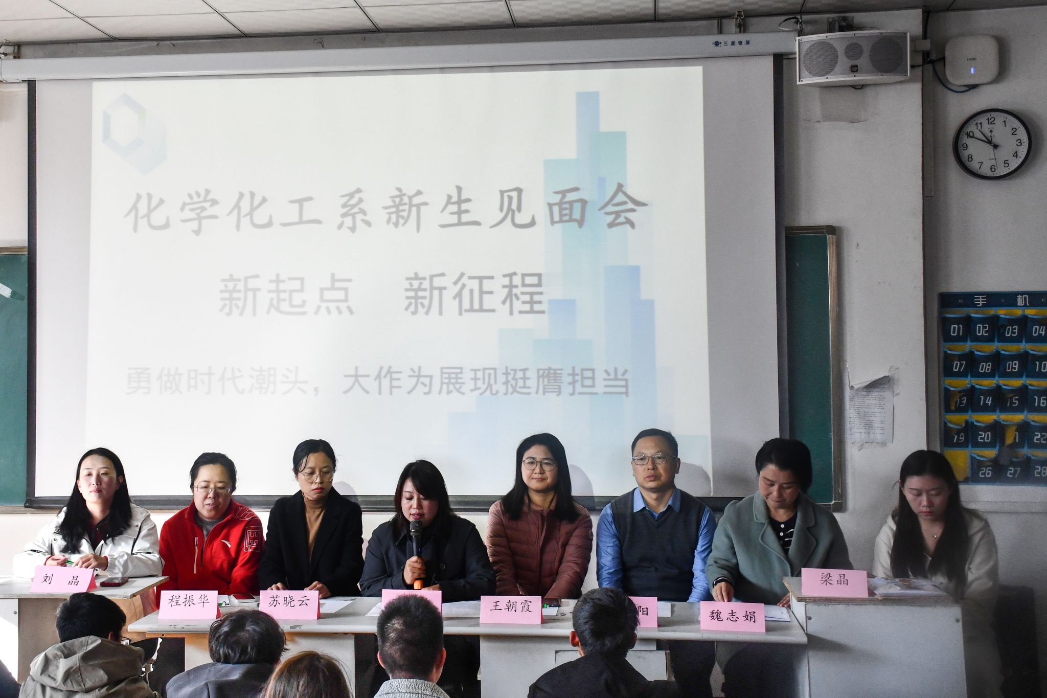 为了让新生更好地适应大学生活,增进新生对学院的了解与归属感,化学化工系于10月24日在南中环校区阶梯教室隆重召开“勇做时代潮头儿,大作为展现挺膺担当”为主题的2024级新生见面会。化学化工系党总支副书记于文金、副主任苏晓云、专职组织员王朝霞以及化学化工系全体教师、2024级全体新生参加了此次见面会。此次新生见面会由专业主任魏志娟主持。