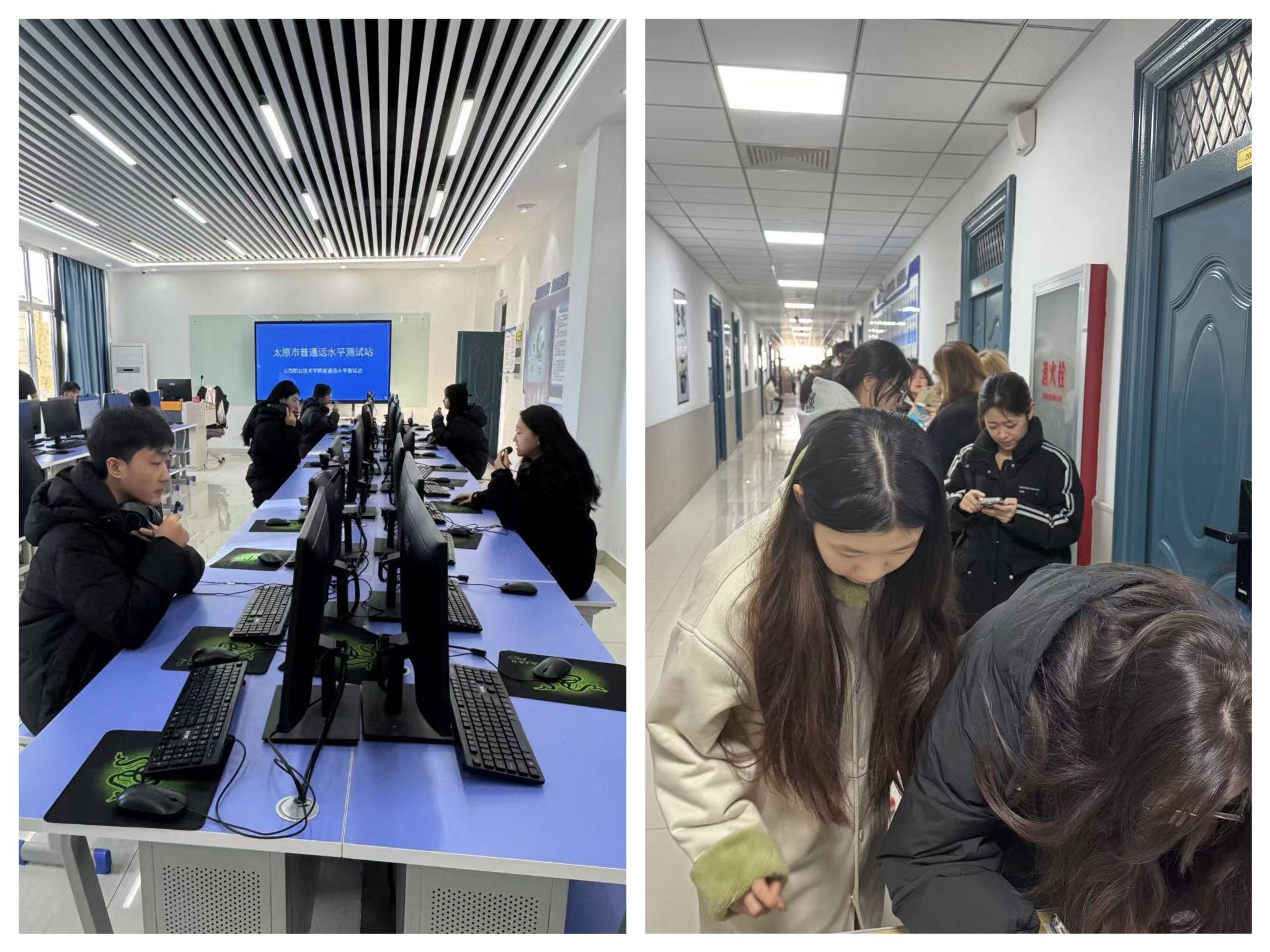 测试当天,基础部副主任赵巧蓉统筹负责,基础部工作人员和长风校区各系分别派出的负责老师、学生志愿者全程协助,有序完成签到候考、核查证件、信息采集等工作。本次测试设有一个候测室,一个拍照室,三个测试室,共完成456名考生的普通话测试。测试过程中,工作人员尽职尽责,配合默契,服务细致;考生严肃认真,安静有序,考风良好。整个测试有条不紊,秩序井然,真正做到了考前教育到位、考试服务到位、技术保障到位。太原市语委的领导和老师们对开云官网普通话测试工作给予了高度评价。