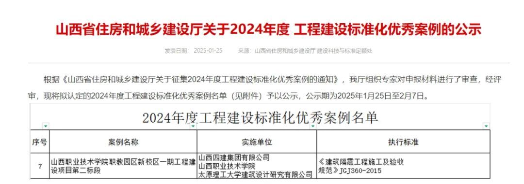 在山西省住房和城乡建设厅开展2024年度工程建设标准化优秀案例征集工作中,我公司参与报送的《开云kaiyun官方网站职教园区新校区一期工程建设项目第二标段》成功入选2024年度工程建设标准化优秀案例。