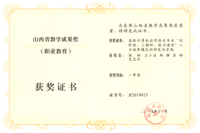 近日,山西省教育厅印发了《关于公布2019年山西省教学成果奖获奖名单的通知》文件,公布了2019年山西省教学成果奖(基础教育、高等教育、职业教育)获奖名单。由计算机工程系主任陈炯主持申报,王小洁、郑静、苏彬、史志杰教师共同参与的《高职计算机应用技术专业“五阶段、三循环、能力递进”人才培养模式的研究与实践》成果荣获山西省教学成果奖(职业教育)一等奖。在此向获奖教师表示祝贺!