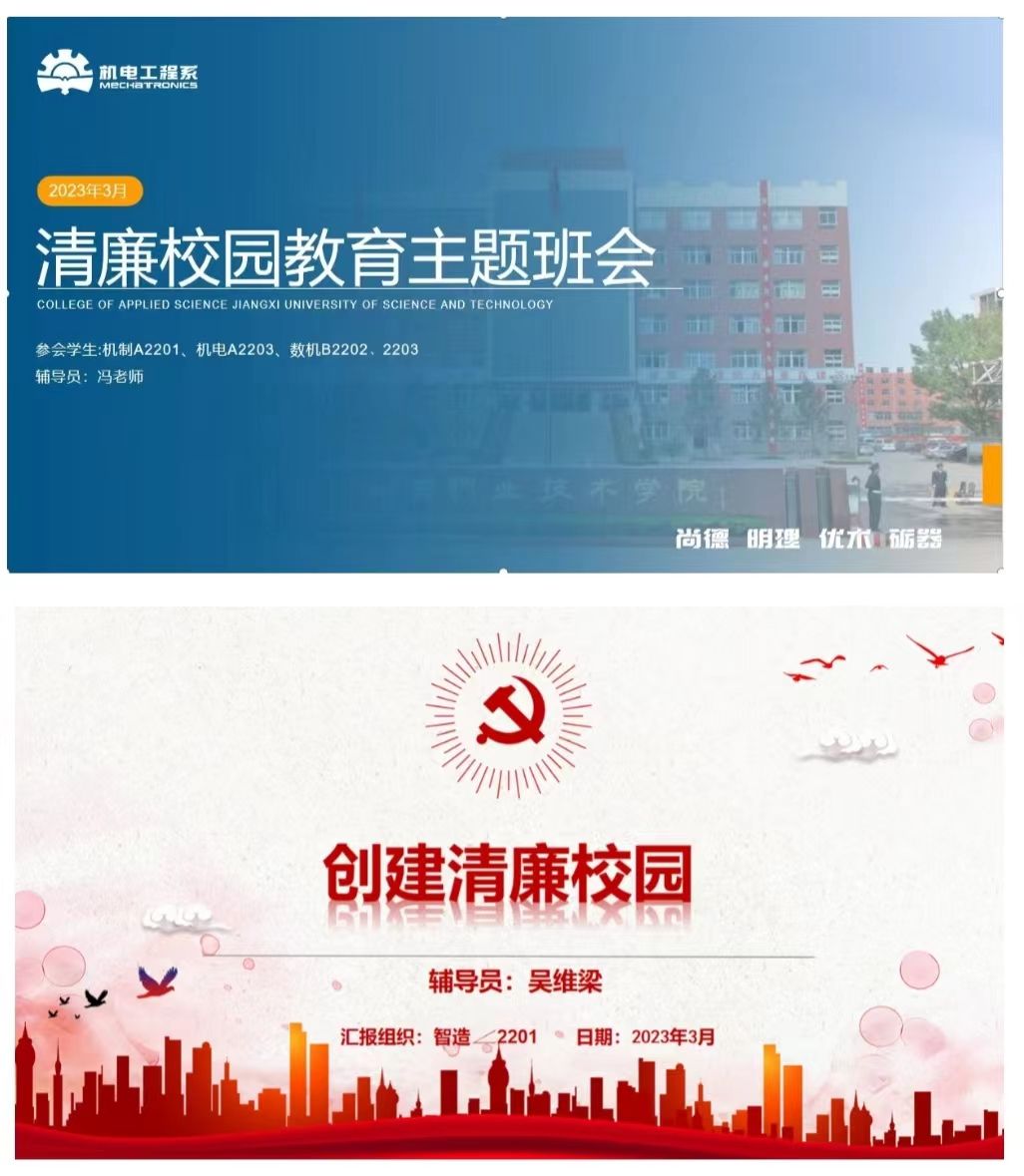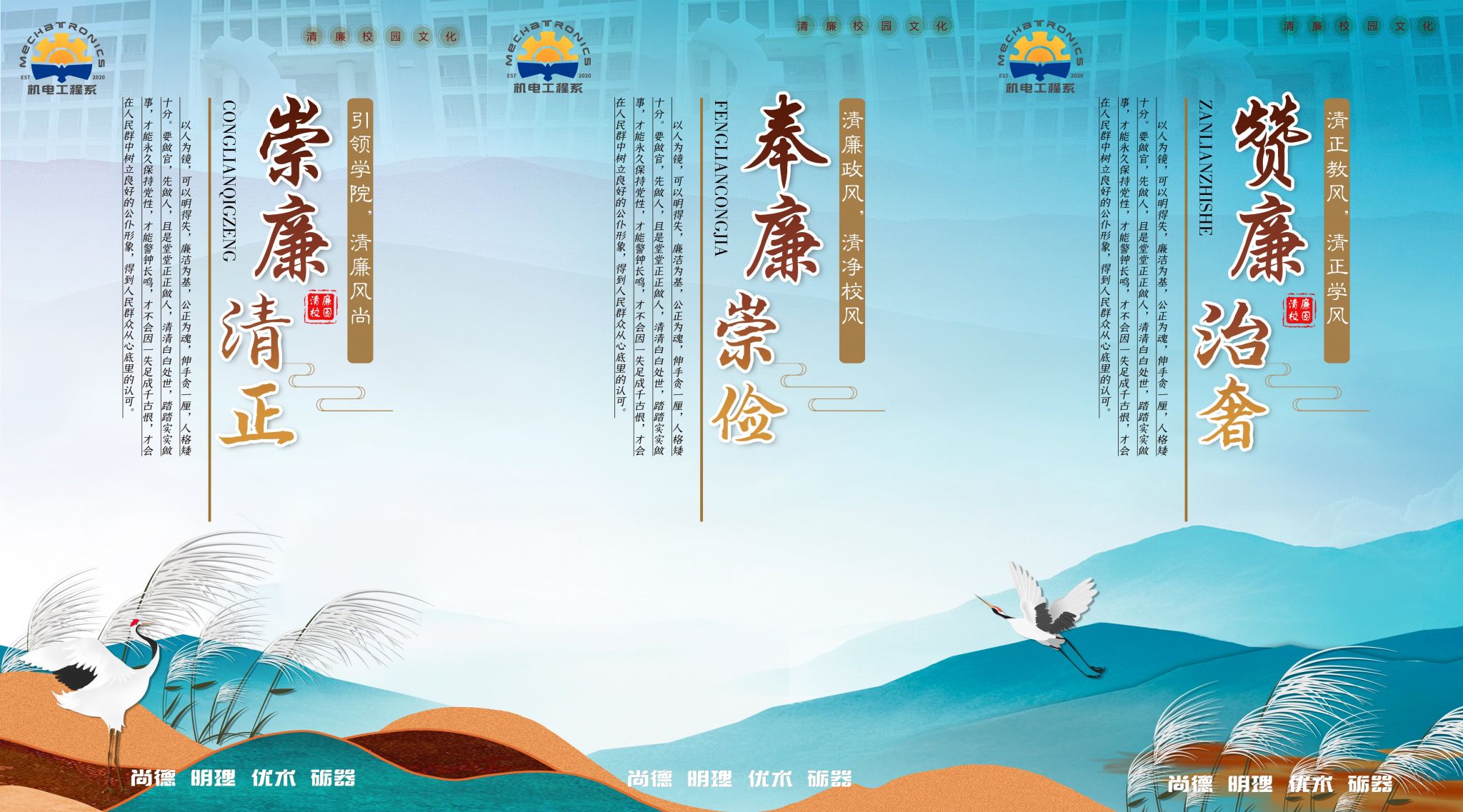 在机电工程系党总支的领导下,根据系部“六项基本任务”高质量发展总体布局,紧密围绕立德树人学风建设的根本任务,在全系范围内组织开展了《“清”风满校园、“廉”花自盛开》的清廉学校建设相关活动,推动全系形成风清气正的新生态,让清廉之风吹遍系部的每个角落。活动形式以线上阵地为主,通过召开清廉专题班会、设立清廉文化墙、制作清廉绘画作品、举办视频征集和网络宣传等活动,将清廉文化、清廉思想、清廉作风融入系部文化建设当中,树立清廉系风,为我系清廉学校创建写下行稳致远的生动注脚。
