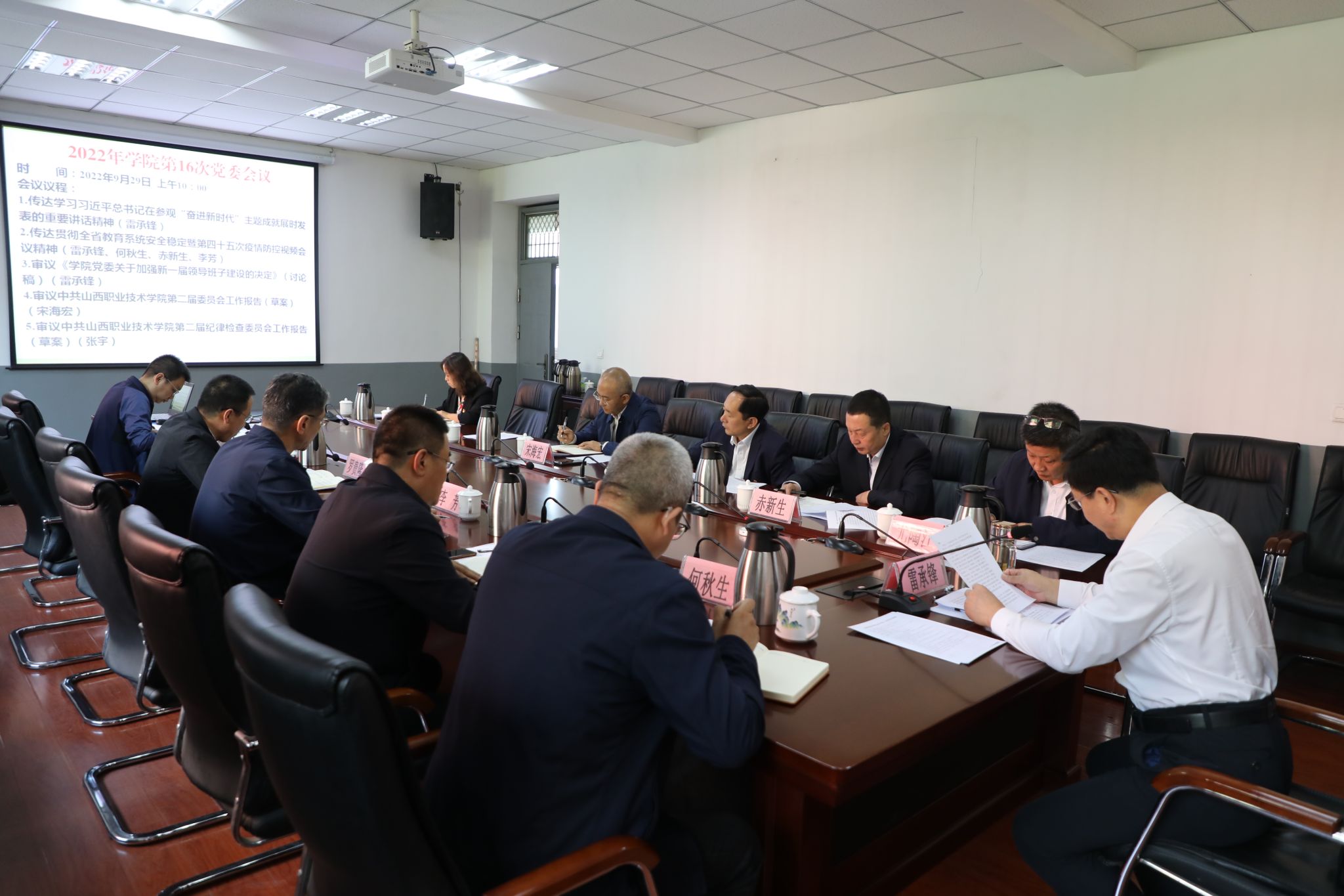 9月29日上午,党委书记雷承锋主持召开学院2022年第十六次党委会议,传达学习习近平总书记在参观“奋进新时代”主题成就展时发表的重要讲话和全省教育系统安全稳定暨第四十五次疫情防控视频会议精神,审议《关于加强新一届党委领导班子建设的决定(讨论稿)》《学院党委工作报告(草案)》《学院纪委工作报告(草案)》《学院第三次党代会筹备情况报告》等事宜。全体党委委员参加会议,相关部门负责同志列席会议。