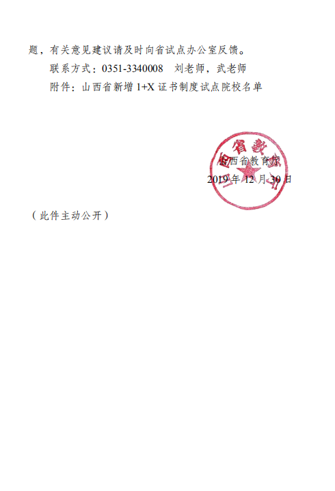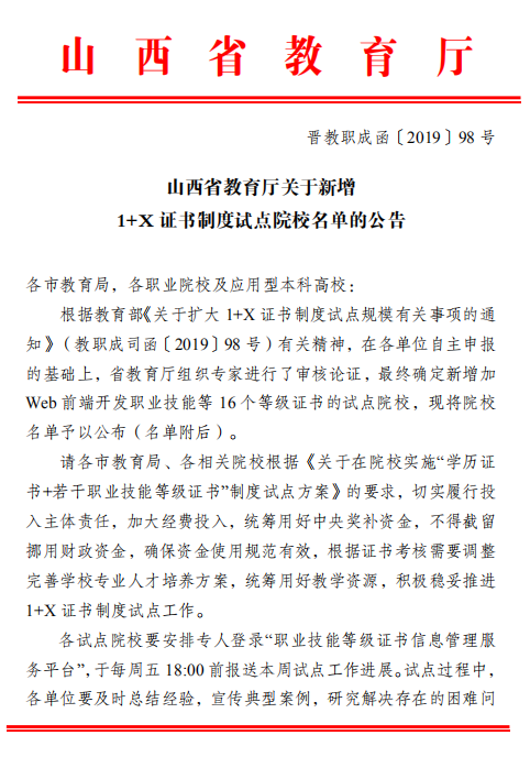 山西省教育厅关于新增1+X 证书制度试点院校名单的公告(晋教职成函〔2019〕98 号)