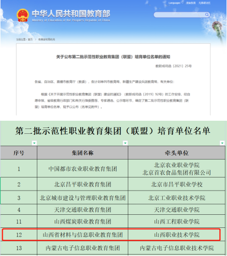 2021年6月,学院牵头的山西省材料与信息职业教育集团入围全国第二批示范性职业教育集团(联盟)培育单位。