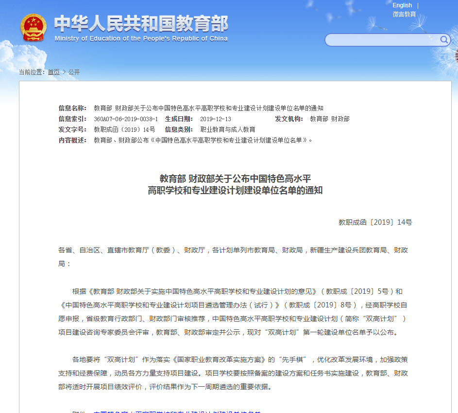 根据《教育部 财政部关于实施中国特色高水平高职学校和专业建设计划的意见》(教职成〔2019〕5号)和《中国特色高水平高职学校和专业建设计划项目遴选管理办法(试行)》(教职成〔2019〕8号),经高职学校自愿申报,省级教育行政部门、财政部门审核推荐,中国特色高水平高职学校和专业建设计划(简称“双高计划”)项目建设咨询专家委员会评审,教育部、财政部审定并公示,现对“双高计划”第一轮建设单位名单予以公布。