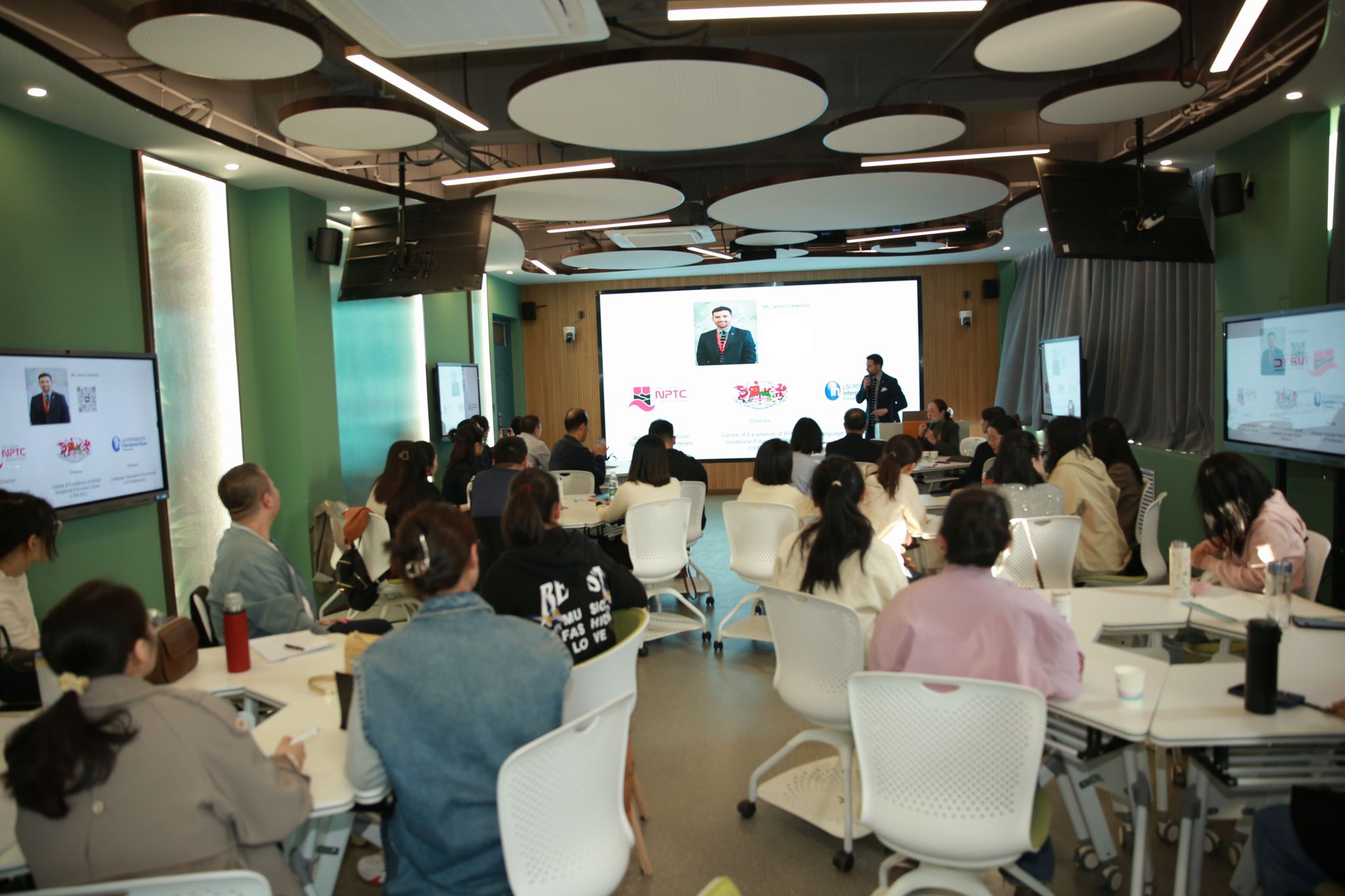 当天下午,开云官网四十余名教师齐聚一堂,参与了一场别开生面的讲座。此次讲座的主讲嘉宾是NPTC学院集团全球运营总监詹姆斯·卢埃林先生,他以生动的演讲和丰富的案例,向在场的教师们展示了英国职业教育与培训的卓越中心、英国职教体系以及英国学徒制职业技能体系。
