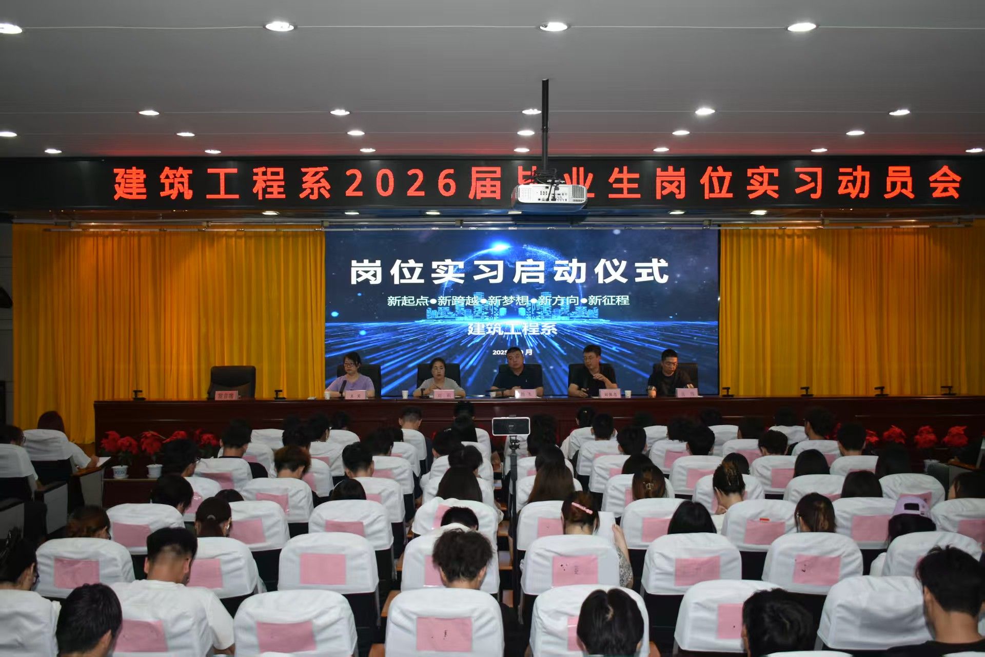 2025年9月14日,建筑工程系召开2026届毕业生岗位实习动员大会。系主任杨飞、副主任刘保忠、副主任刘莉、负责岗位实习的教师岳炜、2026届毕业班辅导员以及各班学生代表出席会议。会议由我系团总支书记王贝主持。 会议伊始,岳炜老师从实习岗位的确定、实习期间的任务安排到实习结束后的材料提交都作了详细说明,帮助同学们建立起清晰、完整的实习认知,为合理规划实习工作提供了明确指引。随后,刘保忠副主任介绍了岗位实习成绩...
