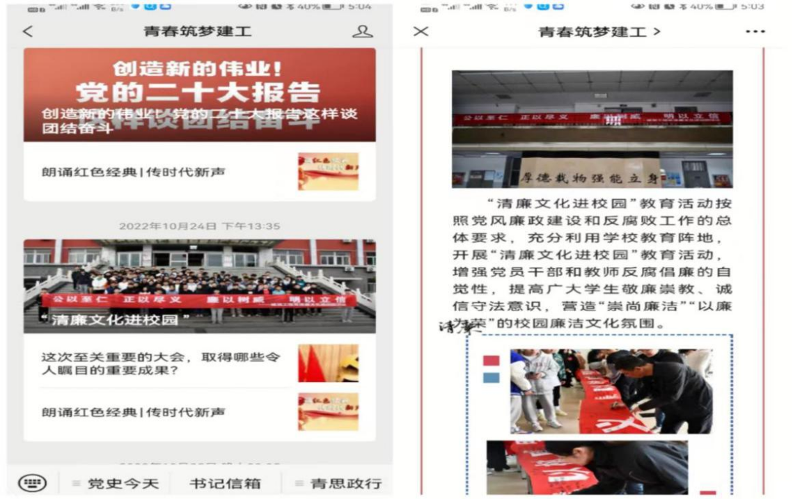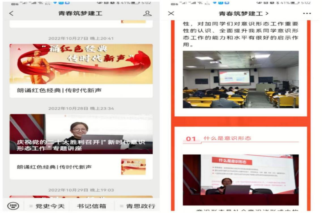 2022年建工系对全系43多个班级,1688余名学生进行持续性、全方位的思政教育。开展了“传承雷锋精神 赓续红色血脉”等各类主题活动20余次。通过微信公众号共发布推文387篇,推出公众号心理特辑8篇,举办了“剧”贴心,伴你行校园心理情景剧剧本征集大赛,“心灵相约,健康同行”心理班会等。各年级辅导员积极开展与学生的谈心谈话,实现全覆盖。