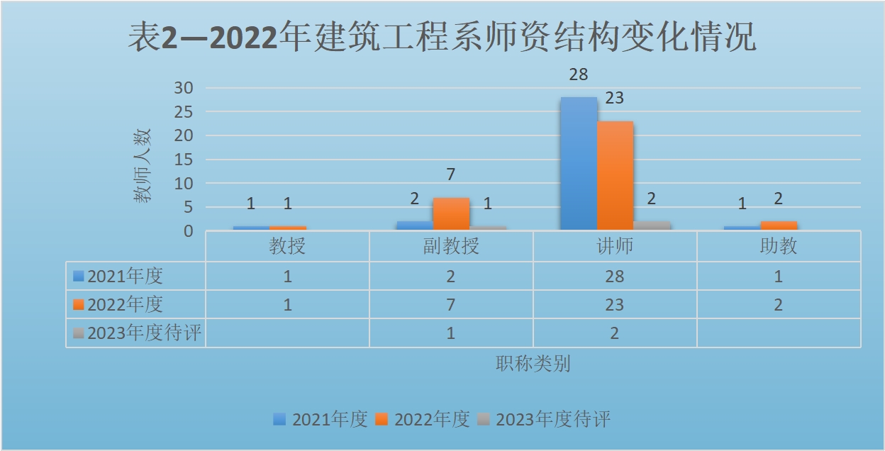 2022年,建筑工程系新增副教授5名,1名教师考取博士,参加各级各类培训26人·次,17人取得省级技能考评员资格,4名教师取得“1+X”培训考评员资格,4名教师通过省评标专家库考试,“双师”教师占比94%,今年有1名教师申报副教授,2名教师转评讲师。职称结构变化见表2。