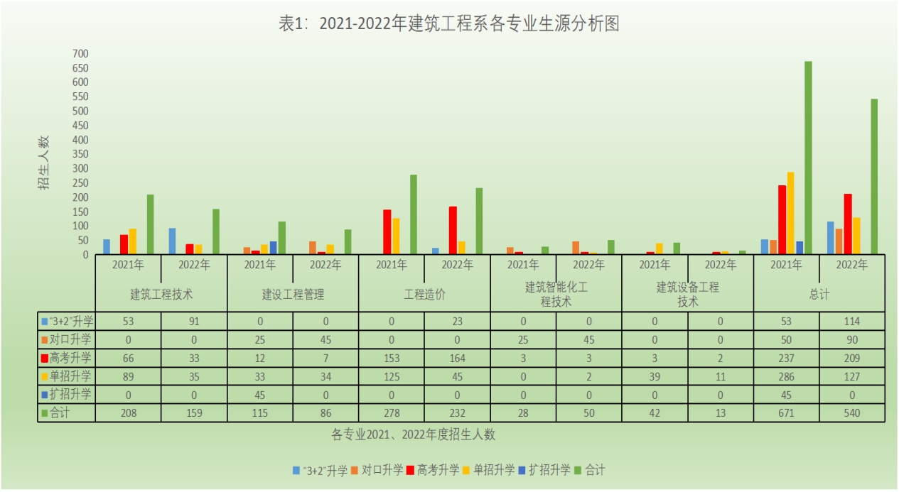 建筑工程系全体教师通过三年努力,生源数量有了明显提高,且生源结构逐步合理。建筑工程系现有学生数量1688人,在校生1211人,实现了在校生人数稳定在1100人基本目标。2022年招生人数为540人,其中高考生源为209人,占比39%,较上一年提升5个百分点。数据见表1。