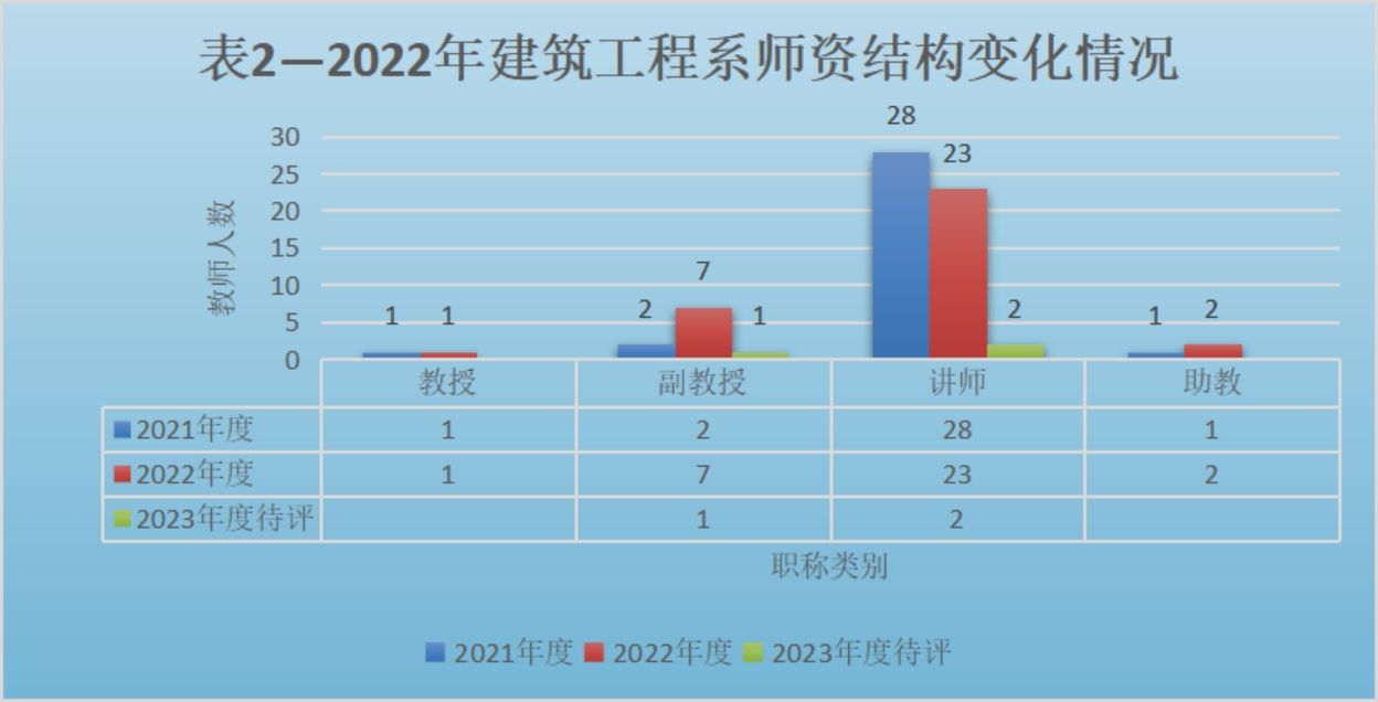 2022年,建筑工程系新增副教授5名,1名教师考取博士,参加各级各类培训26人·次,17人取得省级技能考评员资格,4名教师取得“1+X”培训考评员资格,4名教师通过省评标专家库考试,“双师”教师占比94%,今年有1名教师申报副教授,2名教师转评讲师。职称结构变化见表2。
