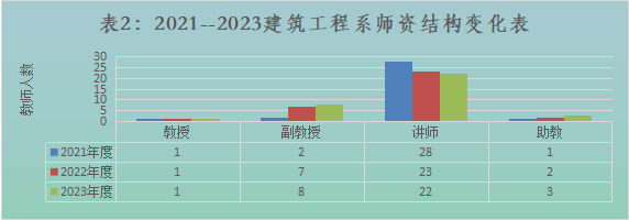 2023年,建筑工程系引进博士2名,在读博士2名,新增副教授1名,参加各级各类培训26人·次,4名教师取得“1+X”培训考评员资格,“双师”教师占比94%,今年有3名教师申报副教授,2名教师评讲师。职称结构变化见表2。