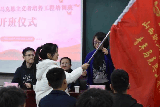 授旗仪式将气氛推向高潮,王贝老师向青马班授旗,学生接旗,标志培训班正式启航,激发学员荣誉感与使命感。