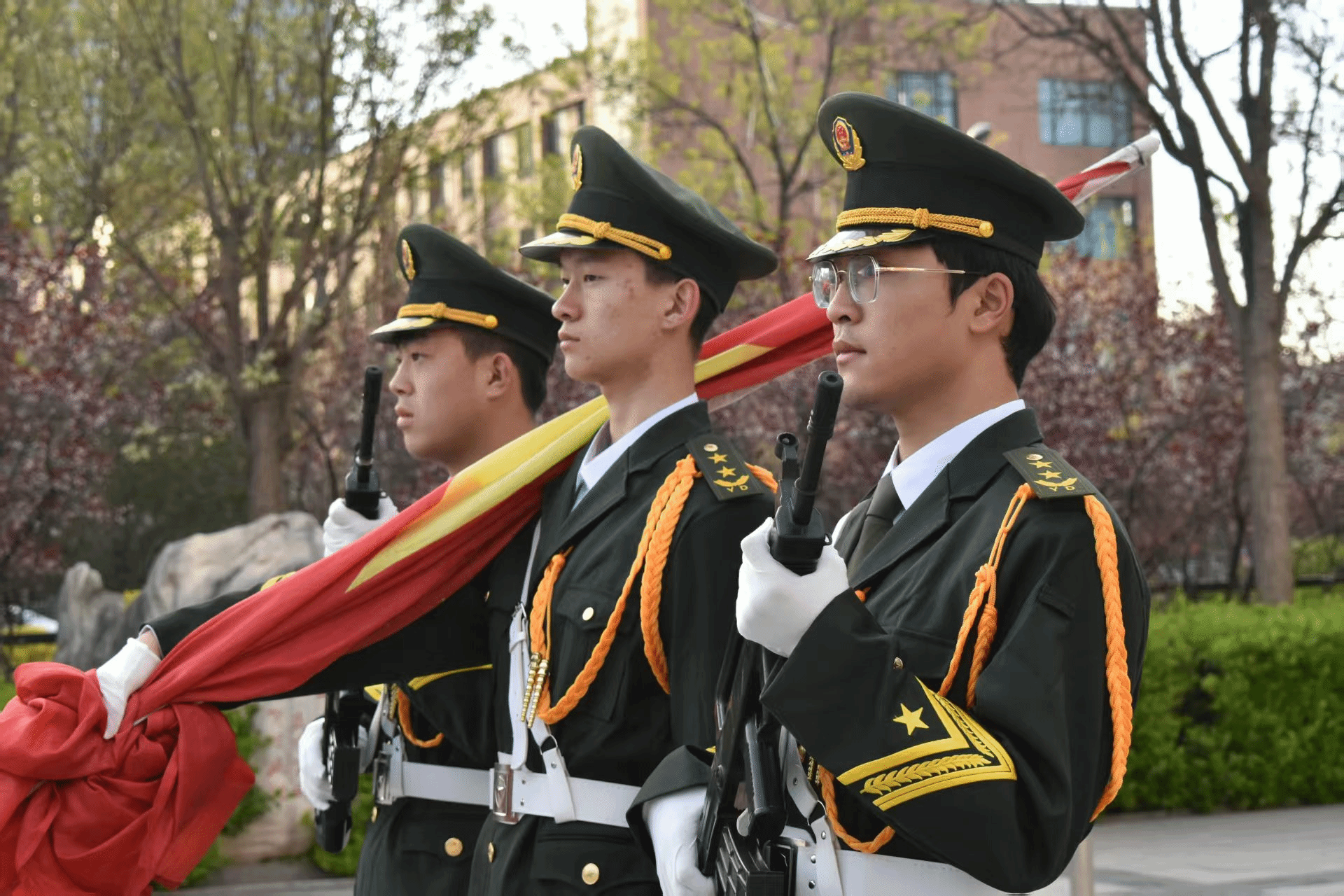 上午7时,升旗仪式正式开始。国旗护卫队迈着铿锵有力的步伐,护送五星红旗至升旗台。伴随着雄壮的国歌声,鲜艳的五星红旗冉冉升起,全体师生庄严肃立,齐唱国歌,向国旗行注目礼。