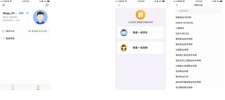 (b) 实名认证:点击我的⸺ ⾝份认证⸺ 选择我是⽼师⸺ 搜索⾃⼰的学校⸺ 填写姓名、⼿机号、学号、验证码点击绑定即可(注:填写的信息必须与后台系统中的基础信息⼀致,不⼀致会提⽰信息不匹配)