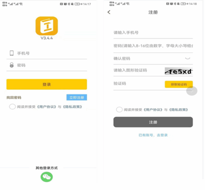 (a) ⼿机注册⼯学云账号:打开⼿机“⼯学云”进⼊登录界⾯,点击右下⻆“⽴即注册”按钮进⼊注册界⾯,填写⼿机号,密码,获取验证码点击注册即可注册成功。