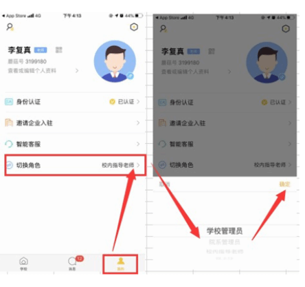 我的界⾯⸺ 切换⻆⾊⸺ 弹出的⻚⾯选择你正确的⾝份,然后点击确定。设置完后,回到工学云⾸⻚就显⽰为选中的⻆⾊;