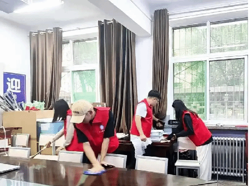 8月29日下午,支部的师生党员同志们来到系部会议室、办公室等场所,开始清洁工作。他们身穿统一的志愿者服装,手持扫帚、抹布等清洁工具,分工合作,有条不紊地进行着打扫。每个人都以饱满的热情投入到这次活动中,不怕脏、不怕累,用实际行动诠释着"志愿清洁,党员先行"的精神。