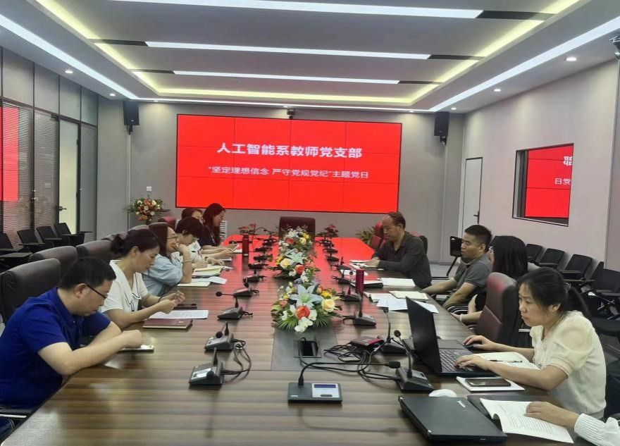为扎实推进党纪学习教育走深走实,进一步提升党员对党规党纪的认知水平和敬畏意识,引导党员坚定理想信念、严守纪律规矩、提高政治站位、改进工作作风。5月21日下午,人工智能系教师党支部在产业学院一楼会议室开展了“坚定理想信念,严守党规党纪”主题党日活动。