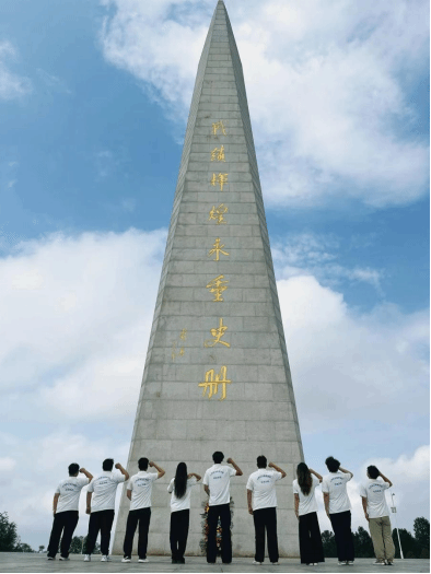 晨曦微露,团队抵达百团大战纪念碑前。这座矗立在狮脑山巅的纪念碑,以三把刺刀造型直刺苍穹,象征着八路军将士在1940年那场震惊中外的破袭战中一往无前的英雄气概。队员们拾级而上,仰望碑身镌刻的 “百团大战纪念碑” 七个鎏金大字,耳畔仿佛回荡着当年枪炮轰鸣与冲锋号角。在纪念碑基座前,全体成员列队肃立,举起右拳庄严宣誓, 誓言声在山间回荡,与纪念碑的巍峨身影交相辉映,定格下青年学子与革命历史的精神共鸣。