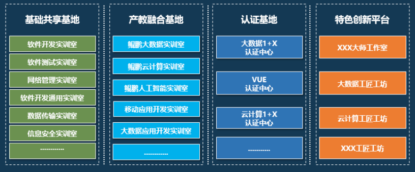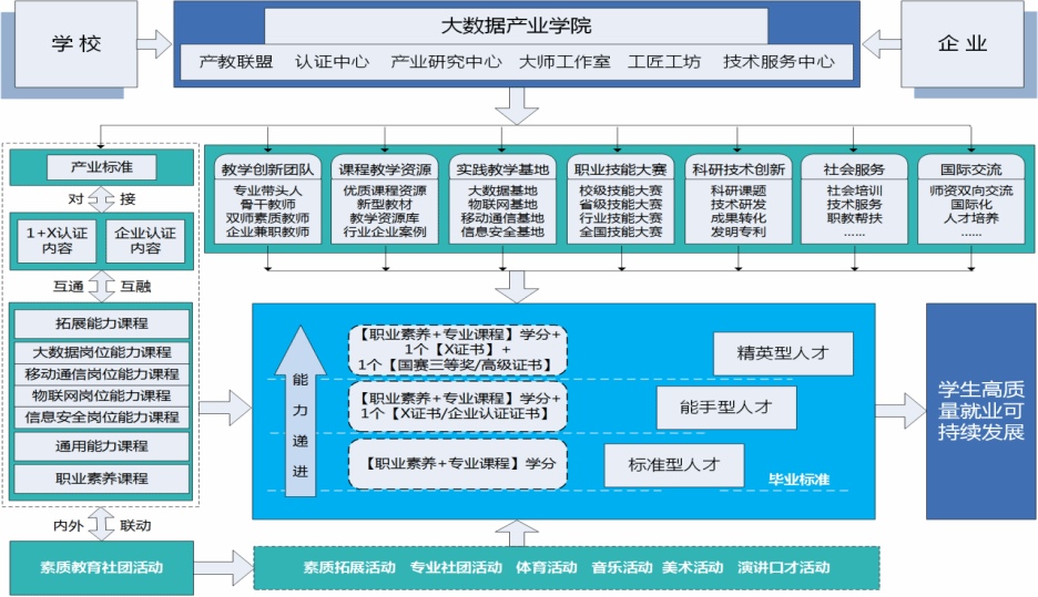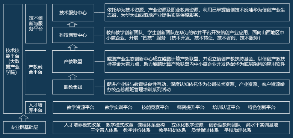 与行业领军企业共建大数据产业学院,为师资建设、人才培养和技术创新与服务提供快捷有效的技术技能创新服务平台。建设科技创新中心、认证中心,构建集人才培养、团队建设、技术服务于一体,资源共享、机制灵活、产出高效的人才培养与技术创新平台。建设技术服务中心,联合行业、企业、职业院校等成立大数据产教联盟,加强与地方政府、行业企业深度合作,建成兼具科技攻关、英才培养、创新创业功能的产教融合平台。依托大师工作室和工匠工坊,打造一个兼具产品研发、工艺开发、技术推广、大师培育功能的高水平技术技能平台,服务产业高质量发展。