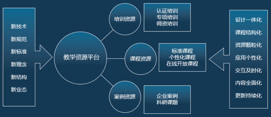 融入“六新”,一体化设计、建设学研共享、服培并举的“三中心”教学资源平台。