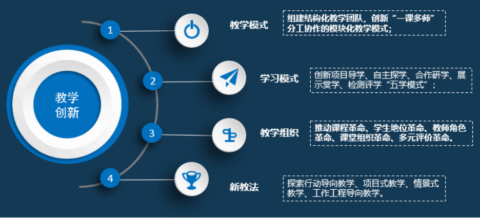 创新教学方法,普及推行项目教学、案例教学、工作过程导向教学等融“教学做为一体”为核心的教学模式;广泛运用启发式、探究式、讨论式、参与式等教学方法;探索实施教师分工协作的模块化教学模式。