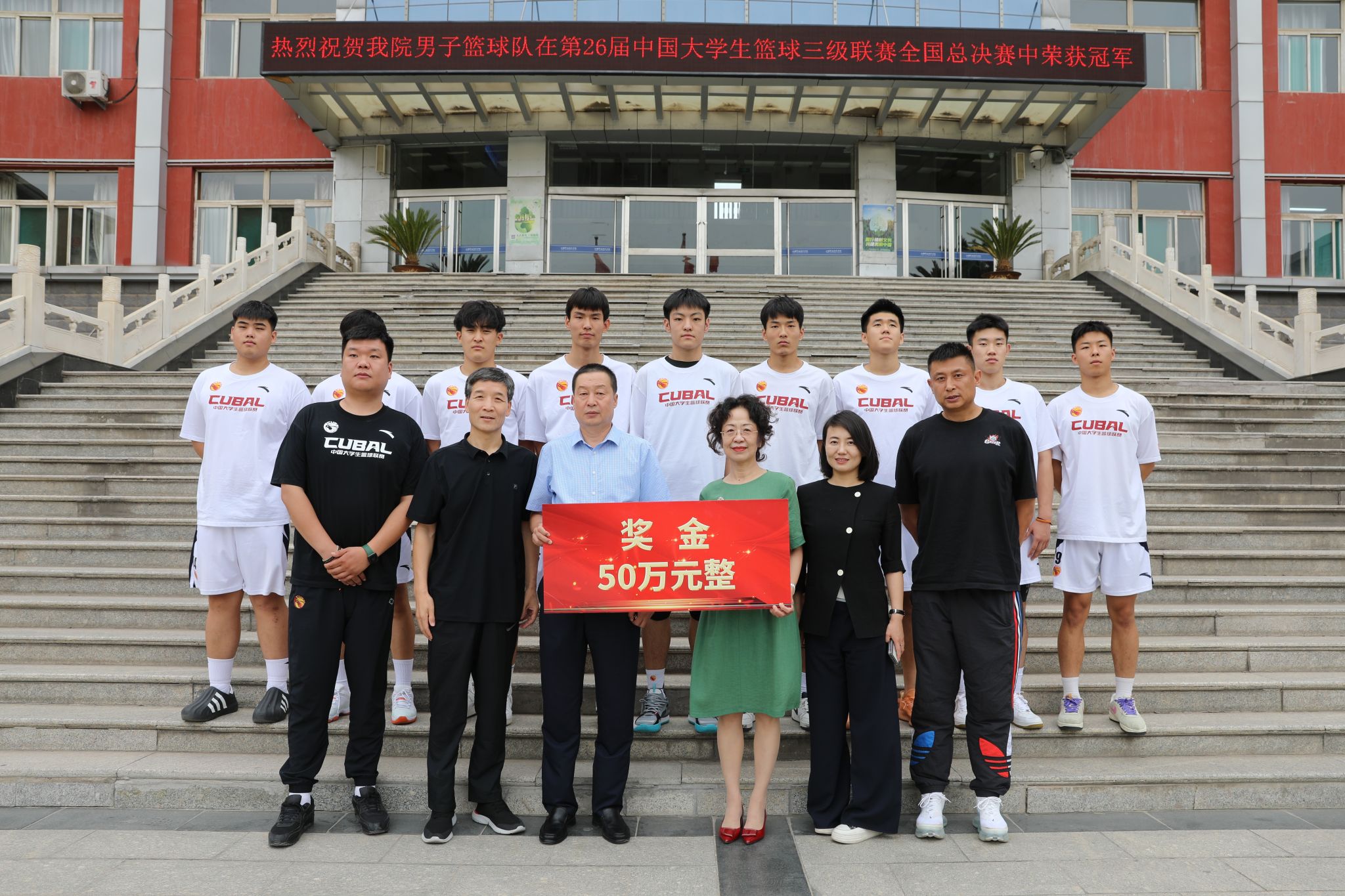 胡雅林代表省教育厅向学院男子篮球队表示衷心祝贺,并强调了体育在立德树人中的重要地位。她指出,篮球队的拼搏精神振奋人心、值得学习,并对学院领导、教练员们的辛勤付出表示感谢。同时,省教育厅为学院颁发了奖金,并合影留念。