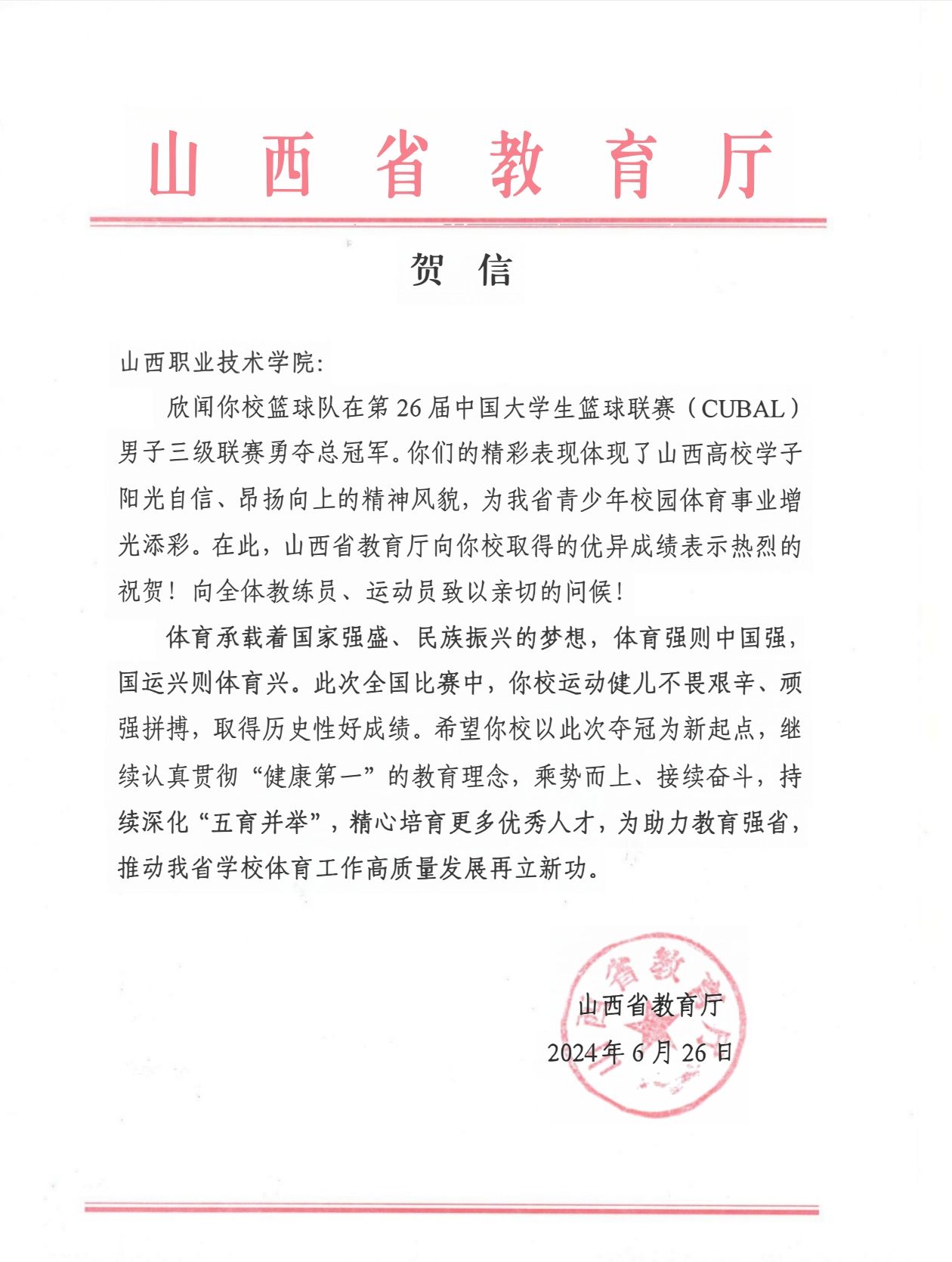 近日,山西省教育厅向开云官网发来贺信,对学院男子篮球队在第26届中国大学生篮球三级联赛全国总决赛中荣获冠军表示热烈祝贺,并对学院在体育教育领域取得的显著成绩给予了高度评价。