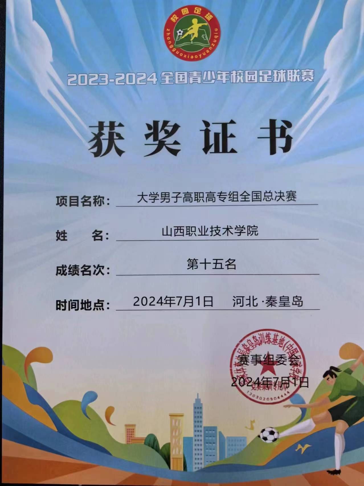 近日,由教育部主办、中国学生体育联合会执行、中国学生体育联合会高职院校工作委员会协办、国家体育总局秦皇岛训练基地(中国足球学校)承办的2023-2024全国青少年校园足球联赛大学男子高职高专组全国总决赛在秦皇岛基地圆满落幕。本次比赛有来自全国各省高职高专组冠军共29支队伍参赛,开云kaiyun官方网站男子足球队凭借扎实的基本功、默契的配合和顽强的斗志,最终获得全国第十五名的成绩,为学院争得了荣誉。