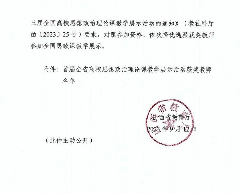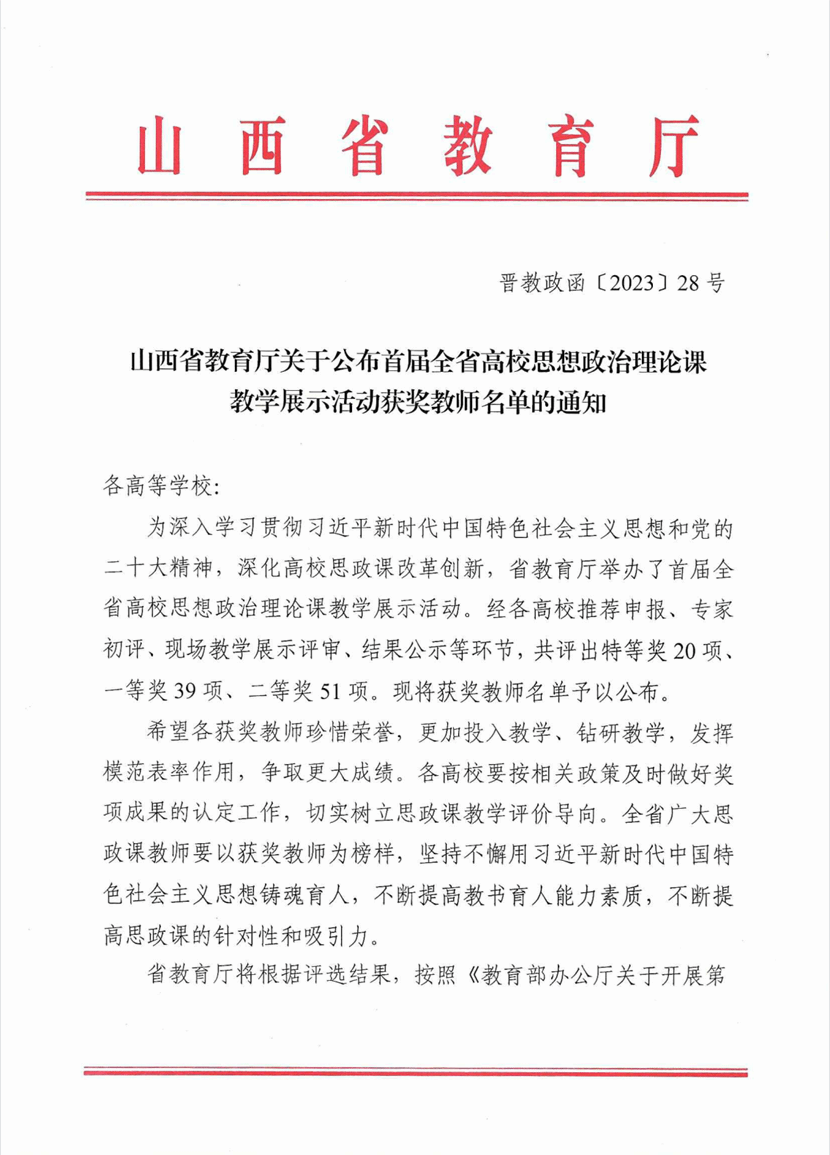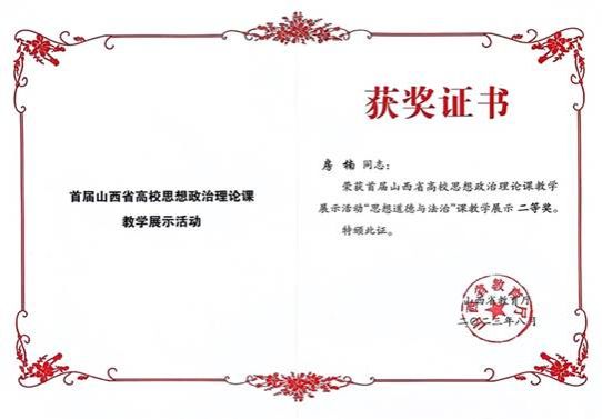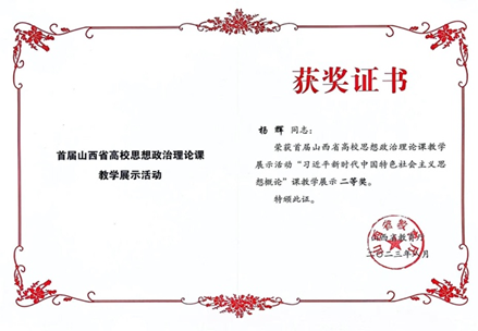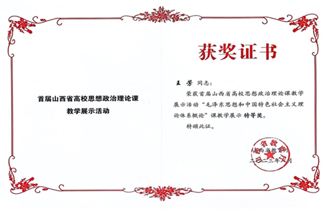 为深入学习贯彻习近平新时代中国特色社会主义思想和党的二十大精神,深化高校思想政治理论课改革创新,提升思想政治理论课教育教学质量和水平,山西省教育厅于2023年6月开始,开展首届全省高校思想政治理论课教学展示活动。本次教学展示活动分本科组、高职高专组、研究生组,共包含9门课程。展示活动分两个阶段,第一阶段经过学校遴选推荐教师、制作上传教案、课件、说课视频、教育厅组织专家初评等环节,挑选出现场教学展示的教师名单;第二阶段是现场教学展示环节,教师随机抽取讲授专题并对其中的一个重难点问题进行讲解,评委现场打分等。最后共评出特等奖20项、一等奖39项、二等奖51项。