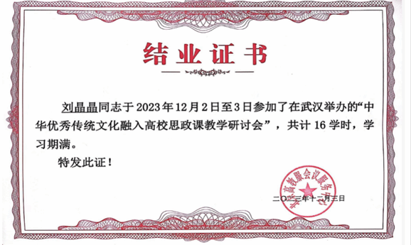 刘晶晶老师于12月1日-4日赴武汉参加“中华优秀传统文化融入高校思政课教学研讨会”,会议深刻分析马克思主义和中华优秀传统文化的高度契合性,阐释中华文明讲仁爱、重民本、守诚信、崇正义、尚和合、求大同的精神特质;并深入解读中华优秀传统文化融入高校思政课教学的价值、逻辑及路径。在教学过程中坚持培元固本和守正创新相统一、坚持以“四个讲清楚”为基本遵循、坚持讲准讲深讲活“六个度”、坚持系统有机融入教学全过程、坚持优化教学方式方法。