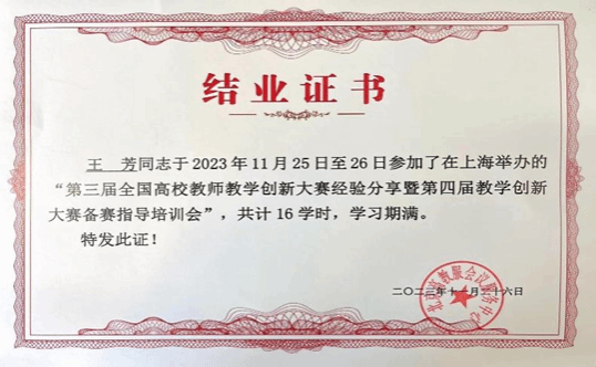 王芳老师于11月24-27日赴上海参加“第三节全国高校教师教学创新大赛经验分享暨第四届教学创新大赛杯赛指导培训会”,大会从教学创新大赛解读、课程设计、课堂实录、提交材料、其他注意事项等方面进行详细阐述;并从官方要求、专家提问、自身感受来深入解读创新大赛如何提高课程特色与课堂魅力。