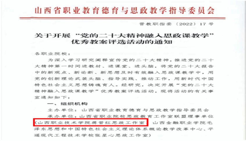 教师党支部书记蒋晋红思政工作室被认定为山西省职业院校铸魂育人“三个一”工程省级名师工作室,工作室组织开展全省职业院校“党的二十大精神融入 思政课优秀教案评选”活动,积极组织学生参加“千马廿行”青年学子宣讲党的二十大精神活动,取得积极成效。