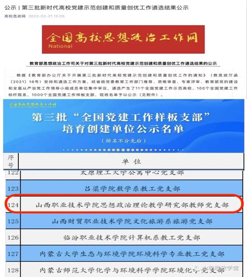 教师党支部委员杨辉主持的“五链贯通育新人”被认定为山西省职业院校铸魂育人“三个一”工程省级特色育人品牌,支部党员们录制的“习近平法治思想、习近平生态文明思想”等19节微课被认定为省级示范微课。