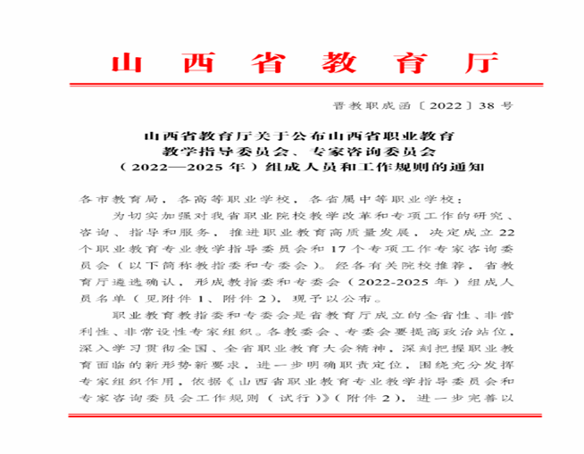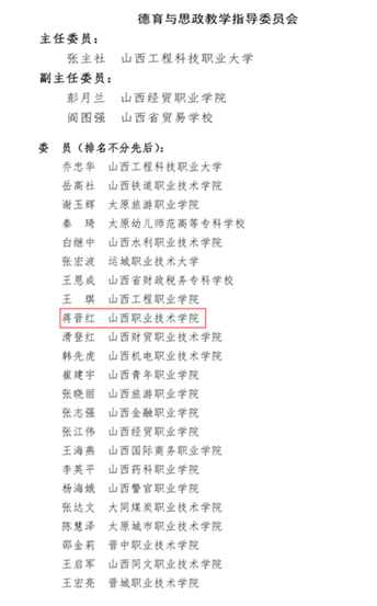 思政部坚持以高水平的党建推动部门建设高质量发展,蒋晋红、王瑛两位老师分别被聘为山西省德育与思政教学指导委员会委员、信息化建设专家咨询委员会委员,在我省职业院校思想政治教育教学改革、信息化建设等工作中发挥研究、咨询、指导和服务作用。