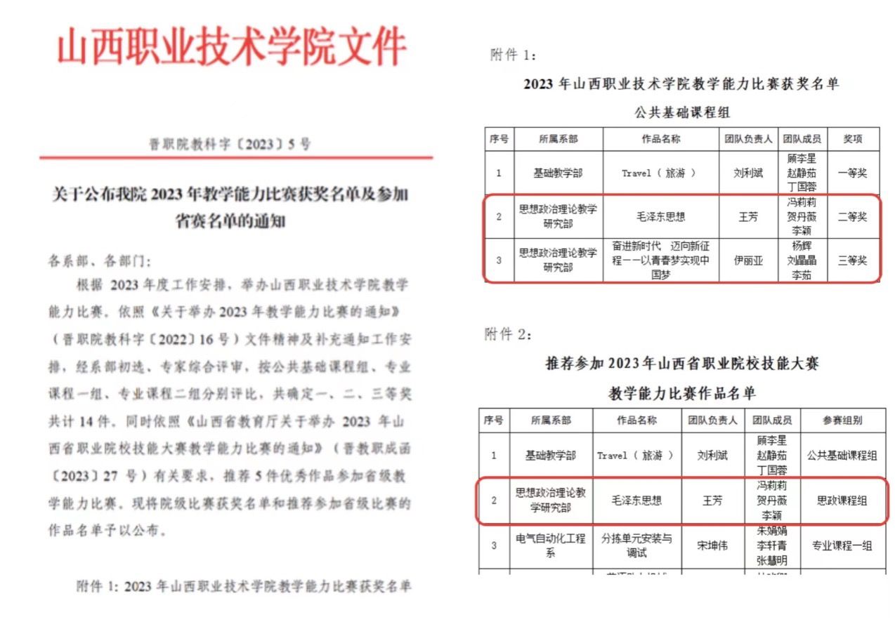 在2023年开云kaiyun官方网站教学能力比赛中,思政部提交三件作品参与公共基础课程组比赛,经过层层选拔,王芳团队代表“毛泽东思想和中国特色社会主义理论体系教研室”提交的《毛泽东思想》参赛作品荣获院级二等奖并被学院推荐参加2023年山西省职业院校教学能力大赛思政组的比赛。由伊丽亚团队代表“习近平新时代中国特色社会主义思想概论教研室”提交的《奋进新时代,迈向新征程》参赛作品获得院级三等奖。