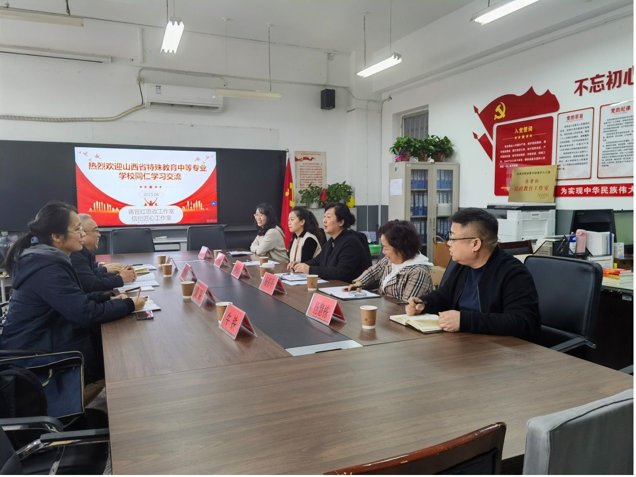 2023年4月24日,山西特殊教育中等专业学校杨俊刚副校长一行3人莅临思政部,就职业院校铸魂育人名师工作室建设、特色育人品牌建设进行学习交流。思政部主任蒋晋红、副主任杨彩平、杨辉,党政办主任杨慧栋、教学名师王瑛参加会议。