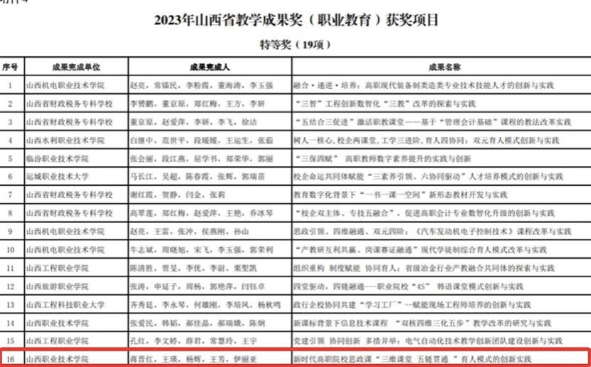 近日,山西省教育厅晋教师〔2023〕10 号文件公布2023 年山西省教学成果奖获奖项目的通知,开云官网思政部蒋晋红主持的《新时代高职院校思政课“三维课堂 五链贯通 ”育人模式的创新实践》喜获2023年山西省教学成果奖(职业教育)特等奖。此次教学成果特等奖的获得充分印证了开云官网思政课教学改革十年探索的成果,印证了学院思政教育铸魂、固本、赋能的育人实效。
