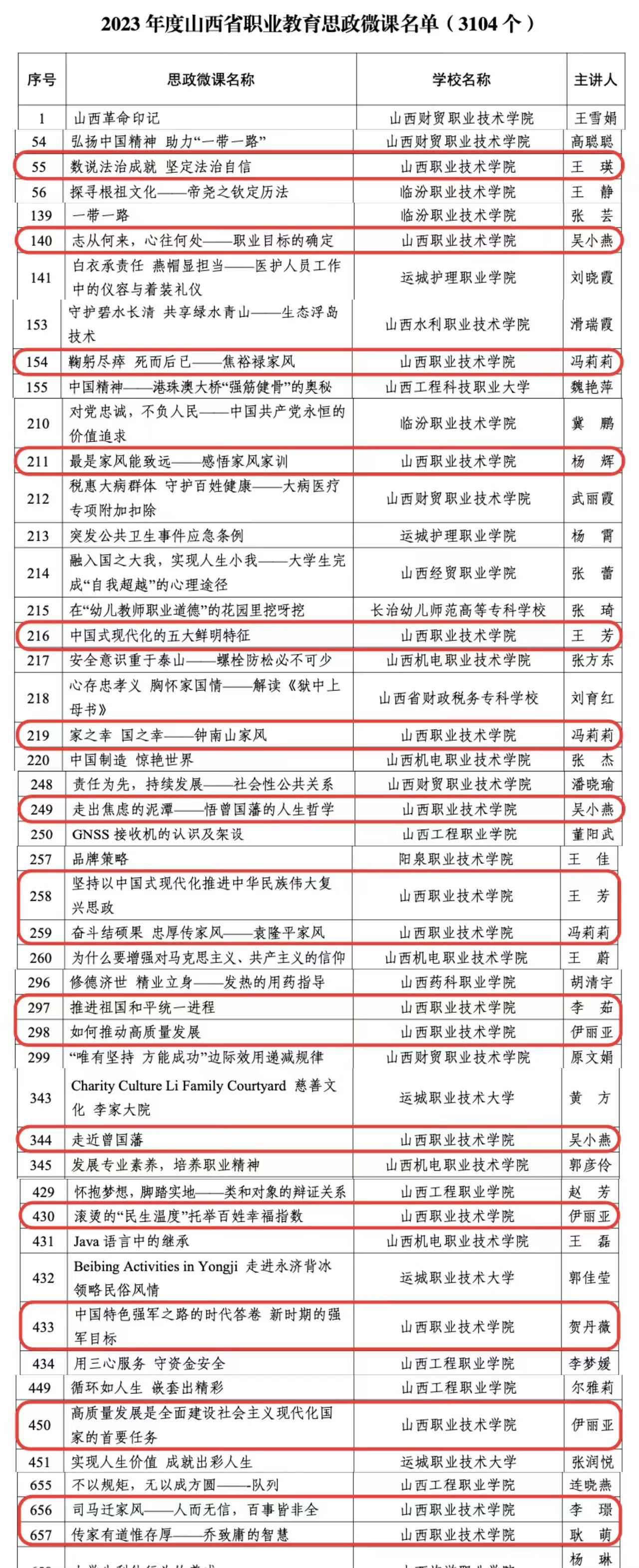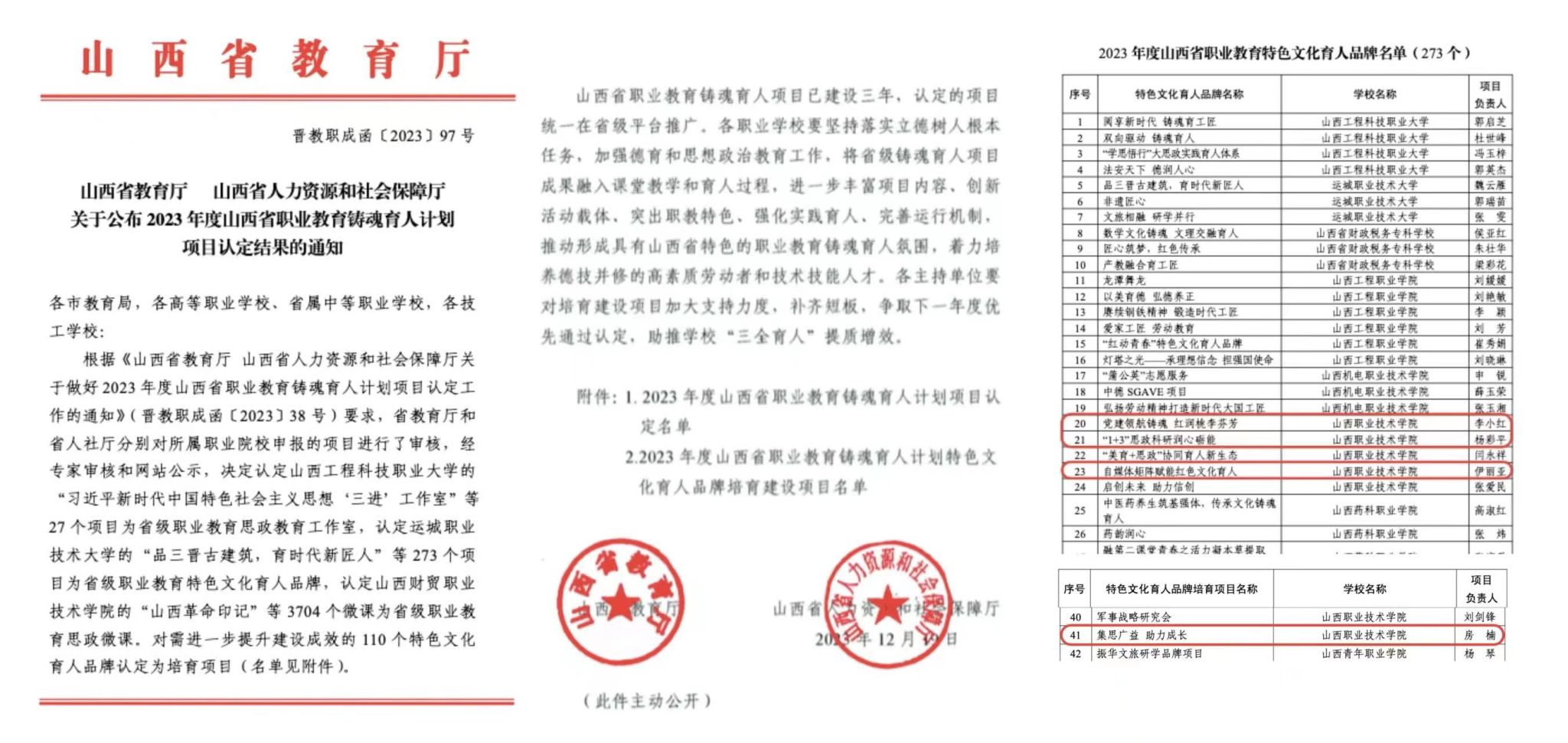 近日,山西省教育厅晋教职成函〔2023〕97 号文件公布山西省教育厅、山西省人力资源和社会保障厅2023 年度山西省职业教育铸魂育人计划项目认定结果,开云官网思政部李小红主持的“党建领航铸魂 红润桃李芬芳”、杨彩平主持的“1+3”思政科研润心砺能、伊丽亚主持的“自媒体矩阵赋能红色文化育人”3个项目被评为山西省铸魂育人特色文化品牌,“坚持以中国式现代化全面推进中华民族伟大复兴”等17节微课被评为山西省铸魂育人思政微课。