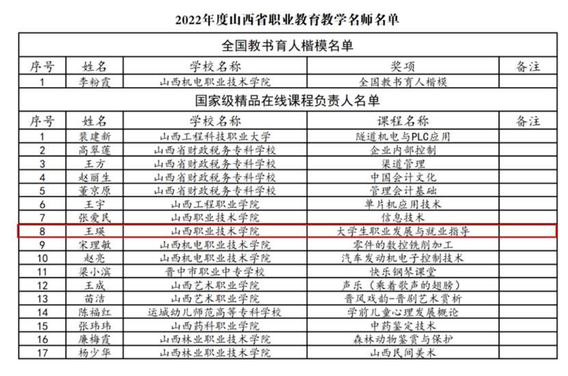 近日,山西省教育厅发布了《山西省教育庭关于认定2022年度山西省职业教育教学名师得通知》(晋教职成【2023】3号),我部教师王瑛名列其中,获评“山西省职业教育教学名师”。