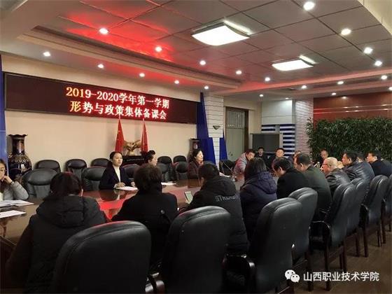 11月21日下午,思政部在办公楼四层会议室组织各系部书记、主任开展2019-2020学年第一学期《形势与政策》集体备课会,备课会由思政部主任蒋晋红主持。备课会结合时政热点、关注焦点,按照《形势与政策》课程标准及教学要点的要求,围绕壮丽70年、中美贸易摩擦、香港问题、十九届四中全会等课题展开深入研讨,提出课程讲授的思路和方案。