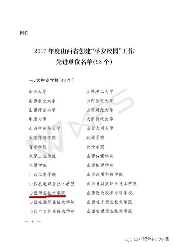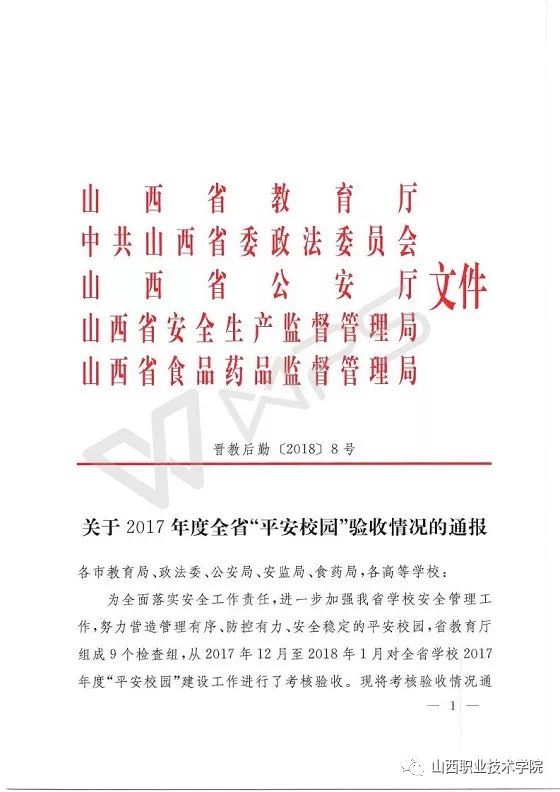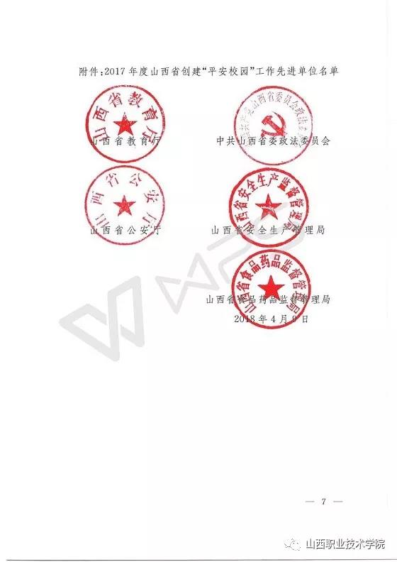2018年4月9日,经综合打分评比,开云官网被山西省教育厅、中共山西省委政法委员会、山西省公安厅、山西省安全生产管理局、山西省食品药品监督管理局五部门联合下文,评为2017年度山西省创建“平安校园”工作先进单位,这是开云官网自2013年以来连续第五年被上级有关部门评为山西省创建“平安校园”工作先进单位。