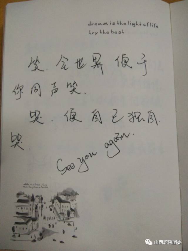 本次活动以班级为单位进行。一本笔记本在各班之间进行传递,各班级的同学在本子上写上自己想说的话,他们有的写对自己未来的期望,有的写对学长学姐们的祝福;本子在每个班都会停留一周的时间,然后于每周的周六在计算机工程系的微信公众平台上推出,供大家欣赏阅读。通过这次活动,人与人,心与心之间的交流更真切,大学生的自信、表达能力也有所提高;同时也拓展了学生们的课外视野,激发了他们的创作能力;这个小小的却价值不菲的笔记本,会好好珍藏我们青葱岁月中的点点滴滴。